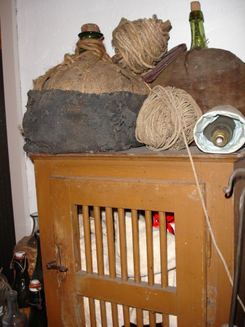 Korbflaschen und ein Schränklein für Brot die Stäbe schützten vor Mäusen welche zahlreich in alten